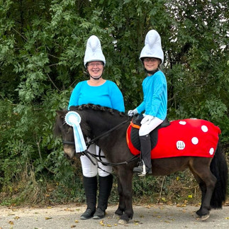 In der Vorwoche am Tag der Einheit (3.10.) errang Anna Müller einen guten 3. Platz im Kostüm-Führzügelwettbewerb in Heddesheim auf dem Pony Fine, geführt von Mama Nina Müller. Die beiden waren als Schlümpfe verkleidet.
